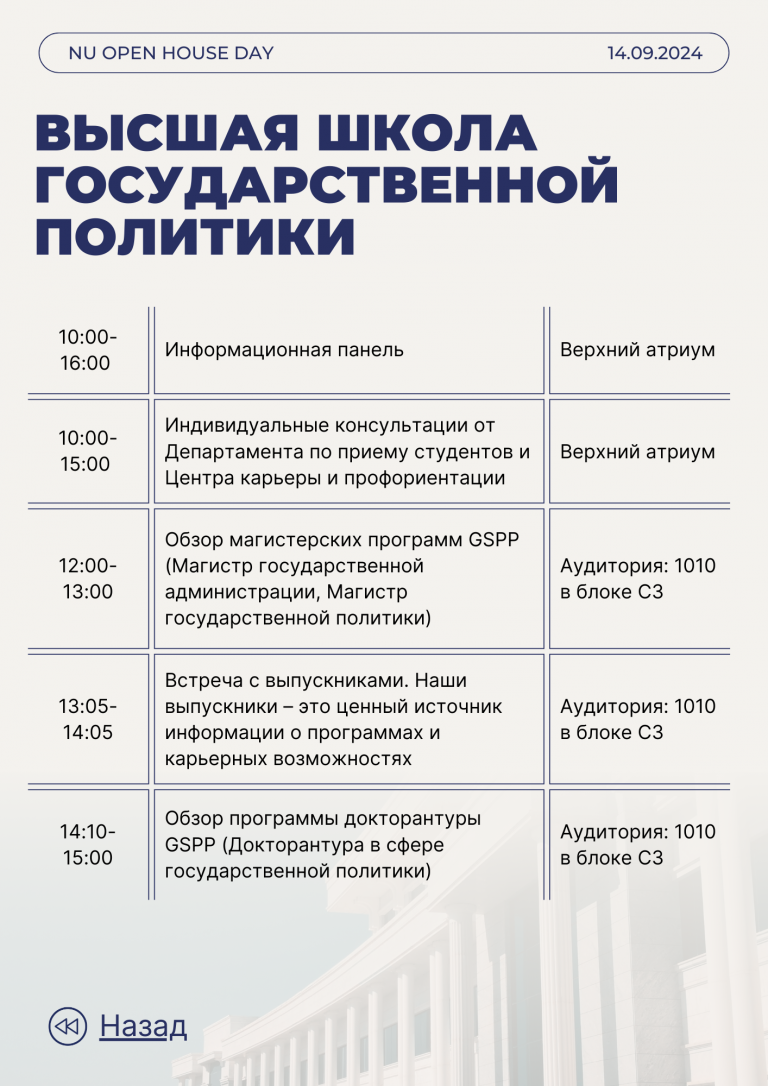 Отметьте в своем календаре 14 сентября: мы приглашаем вас присоединиться к нам и провести этот день, наполненный невероятными возможностями, которые ждут вас в Высшей школе государственной политики NU.